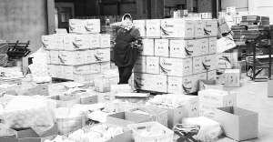 4月26日,在威海一家冷风库旁,大量苹果积压销售困难。