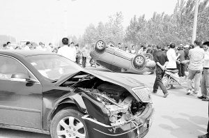 5月9日下午,在淮阳弦歌路与新民路交叉口上演了惊魂一幕。两车相撞后,尼桑轿车四轮朝天躺倒在路边,别克轿车车头受损严重。虽说无人受伤,但两辆车都“伤”得不轻。经了解,当时尼桑车由北向南行驶,别克车由西向东行进,行至路口交汇处,两车相撞。据当地群众介绍,最近,该路口已发生多起事故,他们呼吁有关部门尽快在此交叉路口安装红绿灯,以减少事故的发生。 记者 侯俊豫 摄