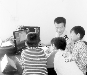 市公安局城北派出所针对留守儿童自我安全防护、电脑法律常识等方面知识十分匮乏的状况,采取自编法律儿歌、自购儿童画报、开办电脑法制小课堂等形式,对留守儿童进行相关教育辅导。图为该所民警在为留守儿童讲授电脑知识 。 陈永团 张保全 摄