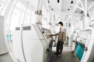 昨日,一名工人正忙碌在面粉生产线上。自5月1日起,我市100家获准生产面粉的企业已全部停止使用过氧化苯甲酰、过氧化钙。(记者 沈湛 摄)