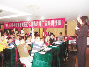 5月20日,超强记忆培训师丁霓老师来周口现场演示教学,新智慧超强记忆方法让100多位慕名前来听讲的家长和孩子大吃一惊!原来记忆力不是天生的,经过短时培训就可以提高2-20倍!图为讲课现场,丁老师在和孩子们互动。(记者 刘彦章 摄)