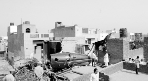 印度一架小型飞机坠入民宅至少10人死亡 这是5月26日在距离印度首都新德里大约30公里处的法里达巴德一处民宅楼顶拍摄的飞机坠毁现场。印度一架小型民用飞机25日晚坠落在新德里人口稠密郊区的两栋民宅上,并引发大火,机上5名乘客和2名飞行员全部遇难,还造成地面至少3人死亡,1人受伤。 新华社发