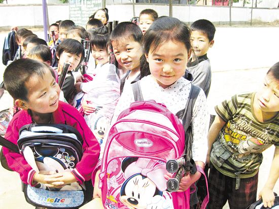 孩子收到礼物后开心地笑了。儿童节前夕,川汇区妇联、科协、对台办、侨联等单位负责人,一起为李埠口乡王保初楼行政村的留守儿童送去了书包、文具盒等学习用品。(记者 王映 摄)