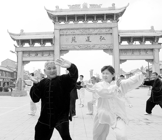 中国传统武术高级教练、鹿邑县65岁的退休工人张金山积极弘扬老子文化,逐步完善了已有150多年的六十四式内家拳术“老子养生拳”。图为张金山在辅导市民练习。(蒋保庆 摄)