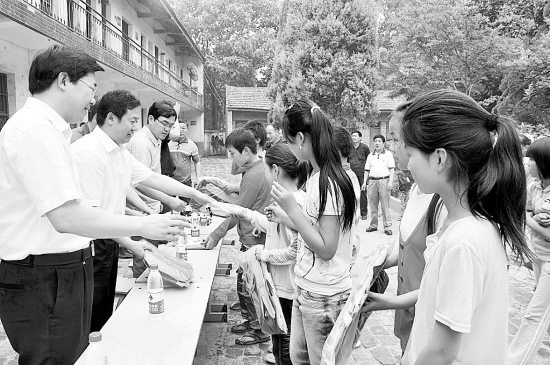 5月30日,项城市审计局在郑郭镇一所小学举行庆“六一”关爱留守儿童捐赠活动。图为该局局长陈敏等为留守儿童发放书包、文具等学习用品。记者 杨光林 通讯员 林昭 摄