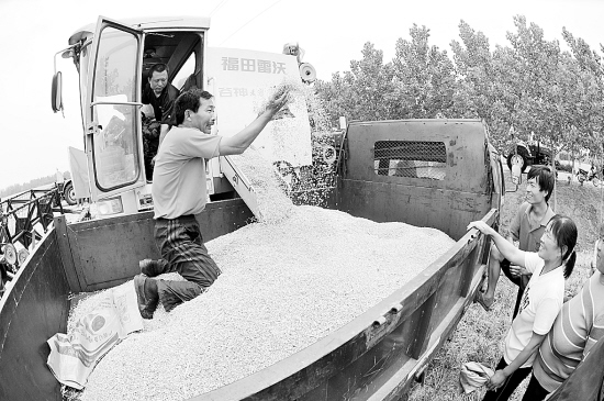目前,我市种植的小麦开始大面积收割,全市到处是一派丰收的繁忙景象。图为商水农民葛四岭手捧新打的小麦喜不自禁。(记者 王映 摄)