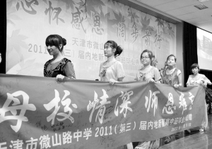6月9日,内地新疆高中班的毕业生手持“母校情深 师恩难忘”的条幅表达恩情。当日,天津市微山路中学为2011届内地新疆高中班的104名毕业生举行毕业典礼,为在天津完成4年学业的新疆孩子们送上祝福。 新华社记者 岳月伟 摄