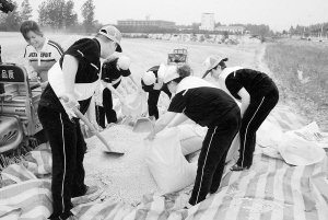 为做好“三夏”保供服务工作,中国石化淮阳石油分公司40多名职工自发组成青年志愿者服务小分队,上门服务,帮扶贫困户收割麦子,送柴油到田间,方便农机作业。图为青年志愿者在淮阳县王店乡大李村贫困户李大爷麦田里帮扶收麦。(记者 沈湛 摄)