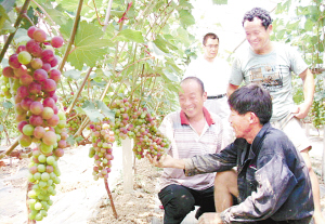 6月13日,鹿邑县现理葡萄合作社基地里,李顺利等种植户正在观察葡萄的成熟情况。近年来,该合作社以贾滩镇柿元行政村的百亩大棚葡萄为基地,带动附近群众建设葡萄种植园16个,种植面积达623亩,亩均收入近2万元。(蒋保庆 摄)