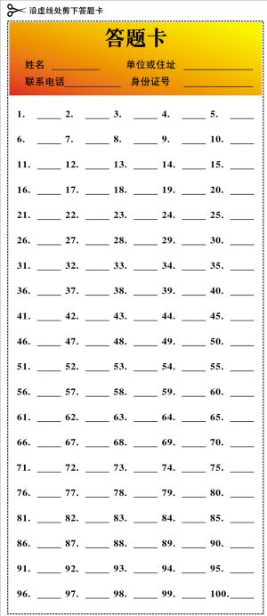 一、答题要求:本次竞赛共100道题,均为单项选择题。活动组委会将在 6月 17 日《周口日报》和中华龙都网上刊发竞赛试题及答题卡。参赛者可任选一种方式进行答题。空白答题卡复制有效。