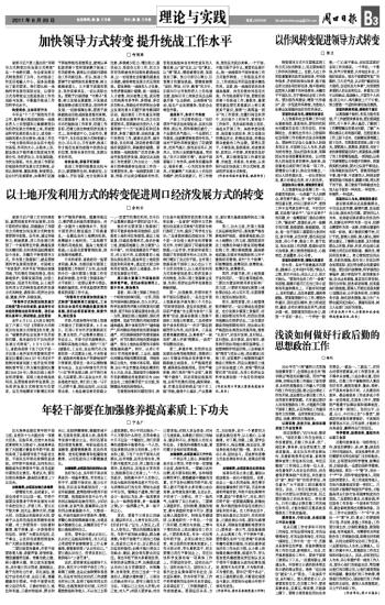 二要加强党性修养。年轻干部要珍重人格、珍爱声誉、珍惜形象,增强道德责任感,常修为政之德,积小德养大德,努力成为思想纯洁、品行端正的示范者,爱岗敬业、敢于负责的力行者,明礼诚信、遵纪守法的先行者,生活正派、情趣健康的引领者。年轻干部要自觉树立良好作风,正确对待权力、地位和利益,正确对待组织、群众和自己,克服浮躁情绪,脚踏实地干事,在服务祖国、服务人民、服务科学发展中建功立业。同时还要自觉加强党性教育,特别是政治忠诚教育、道德情操教育、优良作风教育、党的纪律教育和拒腐防变教育,从而促进自己不断健康成长。