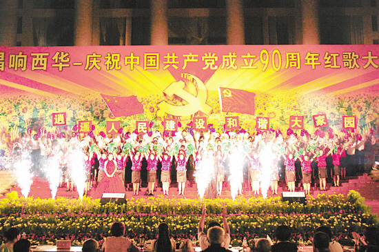 6月26日晚,西华县女娲广场成了红歌的海洋。为期3天的“唱响西华——庆祝中国共产党成立90周年红歌大赛”在这里正式拉开序幕。当晚,上万名来自全县的代表队队员和观众齐唱红歌,用歌声为党的90岁生日献礼。图为该县逍遥镇代表队正在激情演唱。(记者 张猛 摄) ▲