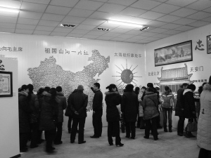 300多平方米的展厅内,一座红色的“收藏宫殿”展现在我们眼前。秋收起义时的毛泽东,延安时期的毛泽东和巍峨的宝塔山,各个时期毛主席像章拼成的主题”祖国山河一片红”的中国地图……每个角落都分类陈列着毛主席塑像、像章、照片、书法、文献、刺绣,足可以看出收藏者匠心独运。一件件红色文物,仿佛把人带进了90年前那段硝烟弥漫、如火如荼的革命岁月。