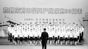 县委合唱团在引吭高歌。昨日,郸城县隆重举办“唱响郸城——庆祝中国共产党成立90周年红歌大赛”活动。县领导朱晓霞、赵爱梅、陈宏、戴亮、崔卫国、王伟、闫冬梅、张孔僧、岳新坦、李涛、张爱联、黄灿香、范鹏翔、张德峰、张艳秋、张云山、邱朝玉和顾涛、张怀根、田豪杰、李恒新等参加了活动。县委、县政府获大赛特殊奖,县教体局、县电业局等8个单位获一等奖,县国土局等13个单位获二等奖,另有24个单位获三等奖。(记者 卢好亮 通讯员 孟宪礼 摄)
