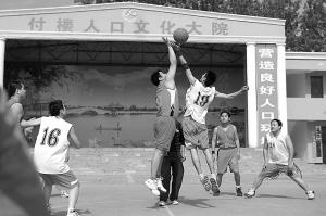 “看谁跳得高!”在农村人口文化大院里,庆祝建党90周年篮球比赛正在进行。