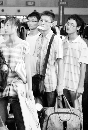 7月4日,在郑州火车站,几名学生旅客准备进站。当日,随着各高校陆续放假,郑州市火车站客流明显上升。根据郑州火车站计划,2011年暑期运输期限自7月1日起至8月31日止,共计62天,将以学生流、民工流和观光旅客流为主。新华社发