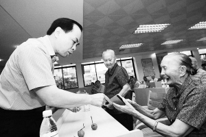 在广东省东莞市南城新基社区居委会,93岁的老人苏日蝉(前右)领到政府发放的高龄老人生活津贴(2010年7月16日摄)。目前,全国已有14个省份全面建立高龄津(补)贴制度,惠及800万高龄老人。我国现有80周岁以上的高龄老人约1899万。今年以来,民政部继续推动各地逐步将本地区80周岁以上老年人纳入高龄补贴保障范围,按月向符合条件的老年人计发高龄补贴,高龄老人的基本生活进一步得到有力保障。新华社发