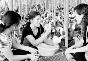 鹿邑县生铁冢乡吕庄村养鸡能手王玉梅和丈夫租地24亩,栽植泡桐苗2万株,林苗中间套种牧草,林下放养土杂鸡2万只,形成了桐阴护草—草喂鸡—鸡粪养树的良性循环链条,去年每亩收入1万多元,今年养殖规模加大,目前成本已收回90%。图为王玉梅在向农业技术人员介绍放养土杂鸡的经验。