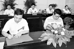 7月7日,周口市农村信用社支持产业集聚区重点项目签约暨“金燕快贷通”小额贷款启动仪式在沈丘举行。副市长陈志伟、市农村信用联社主任何振立及沈丘县领导杨永志、胡恩勇、王智华出席仪式。图为银企双方在仪式上签约。(韦伟 迟驰 摄)