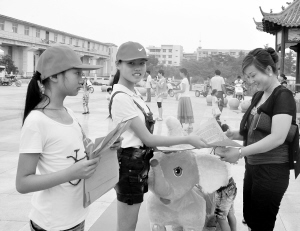 7月5日,为丰富中小学生的暑期生活,增强全民治安防范意识,提高全社会参与平安建设的自觉性,沈丘县综治委在全县中小学生中开展“争做巡防小卫士”活动。图为“小卫士”在县城大闸公园广场向行人发放治安防范小常识传单。(韦伟 迟驰 摄)