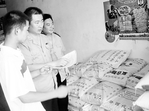 商水县平店乡工商所积极开展“红盾护农保夏播”专项执法活动。图为执法人员对一农资经营店进行检查。(陈建立摄)