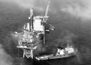 记者乘坐直升飞机拍摄的蓬莱19-3油田溢油事故C平台(7月11日摄)。国家海洋局7月13日表示,蓬莱19-3油田发生溢油事故以后,康菲公司到目前为止采取的溢油处置措施大多是临时性的、补救性的,并不能彻底有效地消除溢油风险,再次发生溢油的可能随时存在,国家海洋局责令康菲公司立即停止蓬莱19-3油田B、C平台的油气生产作业活动。
