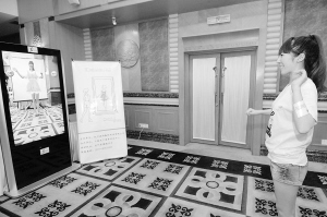 7月13日,一名体验者正在大屏幕前体验虚拟试衣的乐趣。当日,杭州一家公司发布了一款名为“3D互动虚拟试衣间”的产品,顾客只要站在一面特殊设计的大屏幕前,就可以将3D版本的各种款式的服装“穿”在自己的身上,而且不需要触碰屏幕,只要做出简单的手势动作,就可以轻松更换衣服的款式,替换出不同的服装造型。