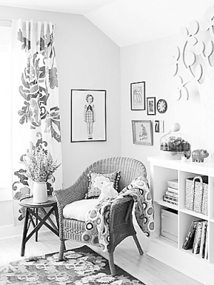 | 花草布艺。蓝色的墙面搭配花草元素的窗帘、地毯、靠包和披毯,尽显清新风格。配上藤椅和木质边几,让空间清凉又不会过于单调。 |