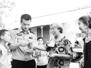 日前,周口市公安局城北派出所邵寨警务室社区民警郭东冉拿着响亮的电喇叭,来到邵寨行政村喧闹的农村“大集”上,利用周边村庄乡亲们赶集的机会,为村民们送上办好的身份证,并广泛宣传网上追逃“清网行动”和日常农村安全防范小常识,受到群众的一致好评和热烈欢迎。 (郁发顺 张保全 摄)