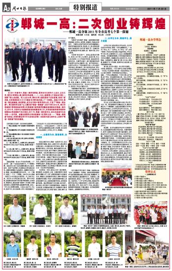 在2011年高考中,郸城一高再创辉煌,勇夺全市文理科个人总分,北京大学、清华大学录取人数,数学单科成绩,一、二、三本上线率等七个指标全市第一,取得了骄人的成绩。考入北京大学、清华大学人数更是创下历史新高,实现了新突破,为即将到来的9月6日建校60周年校庆献上了一份厚礼。短短几年间,郸城一高迅速崛起,连创辉煌,成为全市高中教育的排头兵,打造了“郸城一高品牌”。周口教育界出现了让人瞩目的“郸城一高现象”:2007年和2010年,周口市普通高中管理现场会和周口市普通高中教育教学质量总结表彰会在郸城一高召开;2010年,市委书记毛超峰莅临该校视察指导工作,对学校的教育教学管理和取得的办学成绩给予充分肯定;2011年,郸城一高党委书记、校长刘成章作为全市唯一一位代表,应邀出席清华大学庆祝建校100周年大会……“郸城一高现象”的背后,究竟有着怎样不平凡的创业历程?本报现刊发记者专访,以探寻“郸城一高现象”背后的奥秘。