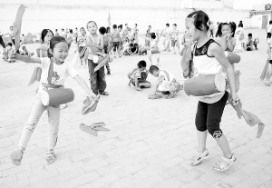 陕西安塞:腰鼓伴我过暑假 7月21日,两个女孩在腰鼓培训的休息时间里斗鼓。陕西安塞县被誉为“中国腰鼓之乡”,安塞县第一小学的暑期腰鼓培训班吸引了大批学生参加。腰鼓表演集武术和舞蹈于一身,孩子们在传承文化遗产的同时也得以强身健体,因此暑期腰鼓培训班深受家长和学生们的欢迎。新华社记者 李一博 摄