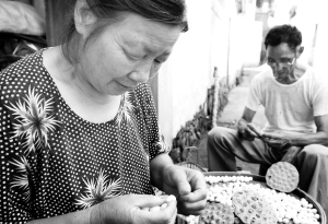 畲乡宣莲富农家 7月24日,浙江省武义县柳城畲族镇祝村莲农汪仙英(左)与丈夫姜舍岳(右)在加工宣莲。宣莲,是浙江武义的特产,种植历史有1350多年,以其质佳味美而与福建建莲、湖南湘莲称为中国三大莲子。近年,武义县柳城畲族镇对宣莲品种进行改良,通过太空3号、太空36号、十里荷等新品种与当地宣莲杂交培育成太空莲,不但产量提高三分之一,莲农收入大幅增加,而且建成十里荷花景区,吸引各地游客前来观荷赏莲,成为畲乡特产开发和乡村旅游的主导产业。