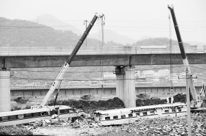 事故车辆被移送至温州西站作进一步调查 7月26日,工作人员在现场进行清理工作。经国务院“7·23”甬温线特别重大铁路交通事故调查组研究决定,相关部门将遗留在现场的事故车辆移送至温州西站,作进一步调查处理。7月23日20时38分,甬温线北京南至福州D301次列车与杭州至福州南D3115次列车发生追尾事故。截至25日23时许,“7·23”甬温线特别重大铁路交通事故已造成39人死亡,其中初步确定身份的有38人。新华社发