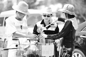 ▲天津环卫工人有了“避暑点” 7月26日,一个“环卫工人避暑处”的工作人员为在街头忙碌的环卫工人送水。当日,30余个“环卫工人避暑处”在天津市南开区挂牌启用,在炎炎夏日为在街头忙碌的环卫工人带来一份清凉的关爱。据悉,这些避暑处均为热心社会单位提供,其中包括饭店、超市、医院、邮局、银行等。