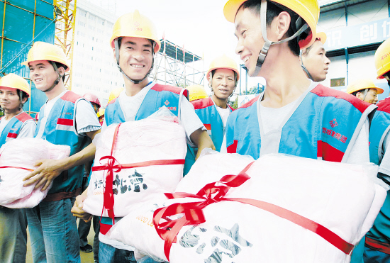 7月27日,参加启动仪式的农民工代表获赠生活与学习物品。当日,由中央文明办、人力资源和社会保障部等部门主办的“帮助他人·提升自己——关爱农民工志愿服务活动”在北京启动。活动内容包括为农民工开展免费的法律咨询、技术培训咨询、农民工子女就学咨询、健康检查、卫生知识讲座、优生优育咨询等服务,旨在动员全社会力量进一步关爱、改善、提高农民工生活和工