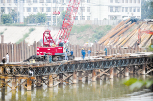 昨日上午,记者在八一路桥施工现场看到,工人们正在紧张施工。据悉,为不影响汛情,工人们已经开始拆除河道中间的便桥,以保证出现洪峰后排洪畅通。目前,八一路桥的桥墩已经建好,就是在汛期内,工人们仍然可以正常施工。