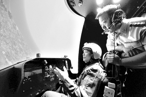 8月3日,空军航空医学研究所高工张信民(左)在新型空间定向障碍模拟器内演示反螺旋错觉。