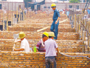 在商水县平店乡刘营村投资1200万元的“房地产进乡镇”项目工地上,几名工人挥汗如雨地忙着垒墙、浇灌和测量。该乡切实把招商引资项目建设作为发展乡域经济的总抓手,今年以来已引资1.4亿元,实施各类项目工程20多个。(赵永昌 摄)