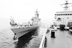 当日,由“郑和”号远洋训练舰和“洛阳”号导弹护卫舰组成的我国海军训练舰编队,结束对朝鲜为期4天的友好访问,从元山港启程回国。 新华社记者 查春明 摄