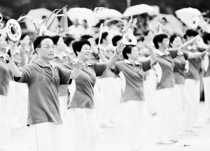 8月8日,福州鼓楼区的老年人表演队在表演柔力球。当日是第三个全国“全民健身日”,为倡导健康文明生活方式、树立运动快乐社会理念,由福州市体育局主办的2011年“全民健身”福州市全民健身展示活动暨福州市第八届社区运动会开幕式在福州举办,共有六个节目,3000人同场依次展示。 新华社记者 魏培全 摄