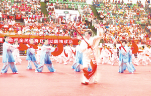昨日上午,精彩的全民健身节目在市体育馆展演。8月8日,我市举行“全民健身日”活动开幕式,以进一步推动全民健身活动开展。