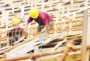 昨日,两名工人冒着炎热工作在建设一线。位于东新区体育馆正南方的市体育场建设项目,对于提升城市形象、完善城市功能和改善民生状况意义重大。该项目计划占地565亩,总投资9800万元,设计座位3万个,预计工期一年半。项目建成后,将为我市申办世界单项体育比赛和全国综合运动会创造有利条件。(记者 沈湛 摄)