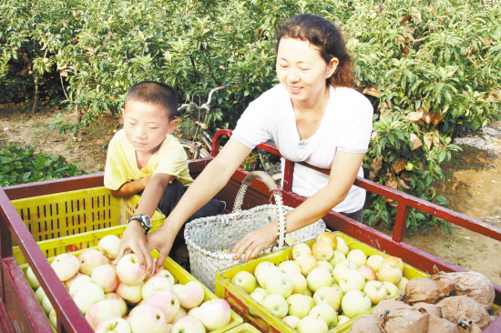 改良更新、科技套袋的无公害优质苹果一直受到消费者的青睐,黄泛区果农杨娜根据这一趋势,大力推广,广泛种植,目前,苹果喜获丰收,纯收入有望达到10万元。(金国明 摄)