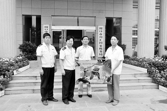 8月19日,天瑞集团周口水泥有限公司向川汇区国家税务局赠送“热情服务 廉明高效”的牌匾,对该局热情服务企业并支持企业发展表示感谢。图为天瑞集团周口水泥有限公司向川汇区国家税务局赠送牌匾。(王映 摄)