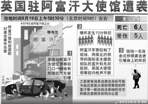 据新华社喀布尔8月19日电 阿富汗警方对新华社记者说,英国驻阿富汗大使馆领事部19日上午遭袭,导致至少6人死亡、5人受伤。阿富汗塔利班宣称对袭击事件负责。