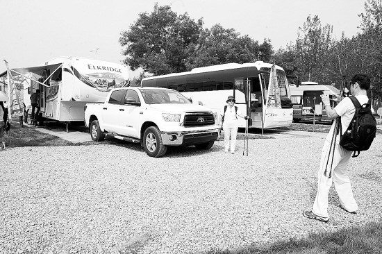 北京建成露营公园首办汽车露营大会 8月19日,市民在北京国际露营公园房车体验区参观。当日,北京国际露营公园在北京丰台南苑建成开放,首届北京国际汽车露营大会同日在这里开幕。该园利用城郊原有的600亩混植林地,在保持林地原生态基础上,增植精品林木,搭建旅居车房,配置房车,形成露营公园。目前,园内栽有树木约13万株,最大的一块草场面积约1.3万平方米,