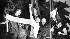 ▲约旦和利比亚人在利比亚驻约旦使馆前庆祝 8月22日,在约旦首都安曼的利比亚驻约旦使馆前,约旦人和居住在安曼的利比亚人挥舞旗帜,庆祝反对派武装进入利比亚首都的黎波里。