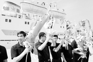 8月23日,“向阳红09”船员在青岛中苑码头受到欢迎。当日,圆满完成我国载人深潜5000米级海试任务的“蛟龙号”深潜器母船——“向阳红09”船返回青岛。据介绍,国家海洋局北海分局介绍,5000米级海试的完成,标志着我国具备了到达全球70%以上海洋深处进行作业的能力,是我国海洋科技发展史上一座新的里程碑。
