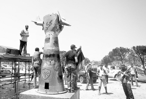 8月25日,在利比亚首都的黎波里阿齐齐亚兵营,反对派士兵在卡扎菲所立的“捏碎美国飞机”雕塑前庆祝胜利。利比亚反对派在23日攻入被视作卡扎菲权力象征的阿齐齐亚兵营。