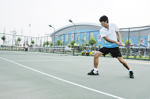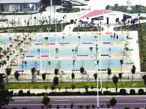 体育馆外,树木花草绿意浓浓,盆景花池竞相开放。这里有对公众开放的运动设施:西侧有 6个标准露天篮球训练场,3个露天篮、排球套用训练场,4个标准门球场,8个乒乓球台和2个羽毛球练习场;东侧有3个标准网球场和1个标准足球训练场。另外,东西两侧各安装有30套不同类型的健身器材,可供市民使用。